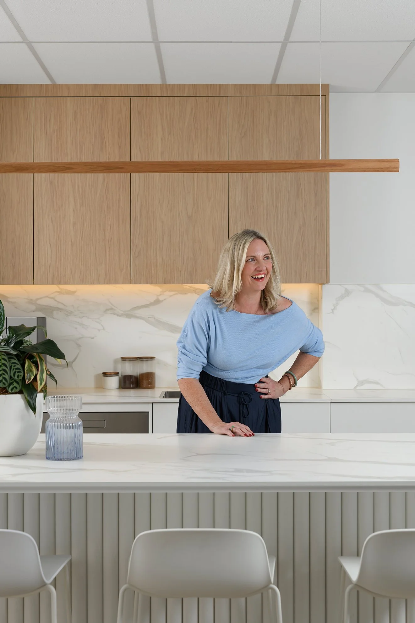 Bronwyn photographed in a recent project for Xact Accounting, Brisbane. A full office fit out with this beautiful kitchen designed to create a sanctuary in a relaxed Queensland style for staff and clients to enjoy. Photo by Mindi Cooke
