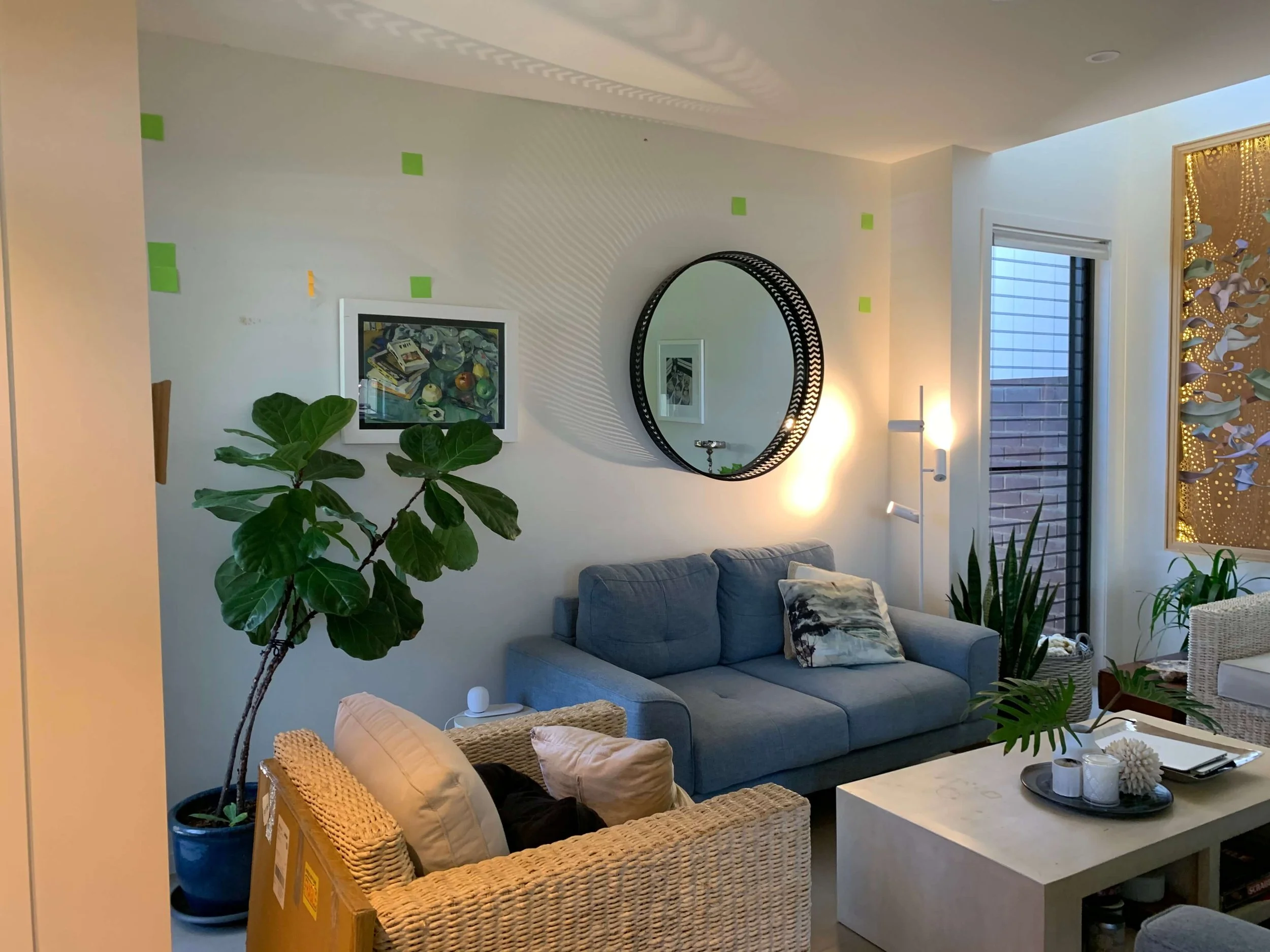 The Clients wanted to improve the look and feel of their open plan space having moved in with furniture from a previous house that had larger proportions. Hannah & Co Design used the owners' favourite artwork as the jumping point to develop the design, rich in Autumnal colours, with layers of texture and natural materials to create a cohesive space, changing up the layout of the space to create better flow and a feeling of spaciousness. The furniture and the style also adding to the more open and airy feeling. A stunning result that took the clients out of their comfort zone but to a design they love. Photography by Mindi Cooke. Scroll further below for before shots to see the transformation.